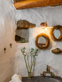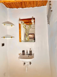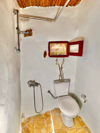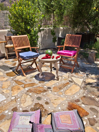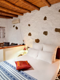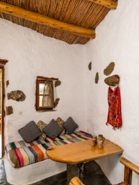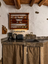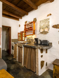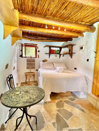 Kelari cottage (18 m²) is laid out in an open plan with a double bed (that sleeps 1-2 people), a fully equipped kitchenette, a bathroom with a shower. Kelari is the smallest cottage offered, cozy and comfortable, with a small window looking out onto a beautiful shared garden. It has direct access to a private veranda with a sitting area, as well as to a beautiful garden (shared between 3 cottages) with blooming flowers and hummingbirds, hammocks, sun beds, a monastery dining table, and a 6m x 5m wooden floor deck.