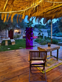 Mpaksis Cottage (25 m²) is laid out in an open plan with a double bed (that sleeps 1–2 people), and small sitting area with a fireplace for atmospheric nights. There is a fully equipped kitchenette, and a bathroom with a shower. Mpaksis offers direct access to a beautiful garden (shared between 3 cottages) with blooming flowers and hummingbirds, hammocks, sun beds, a monastery dining table, and a 6m x 5m wooden floor deck.