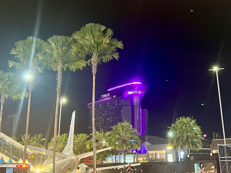 Terminal 21 was pretty-in-pink (and purple) all lit up at night.