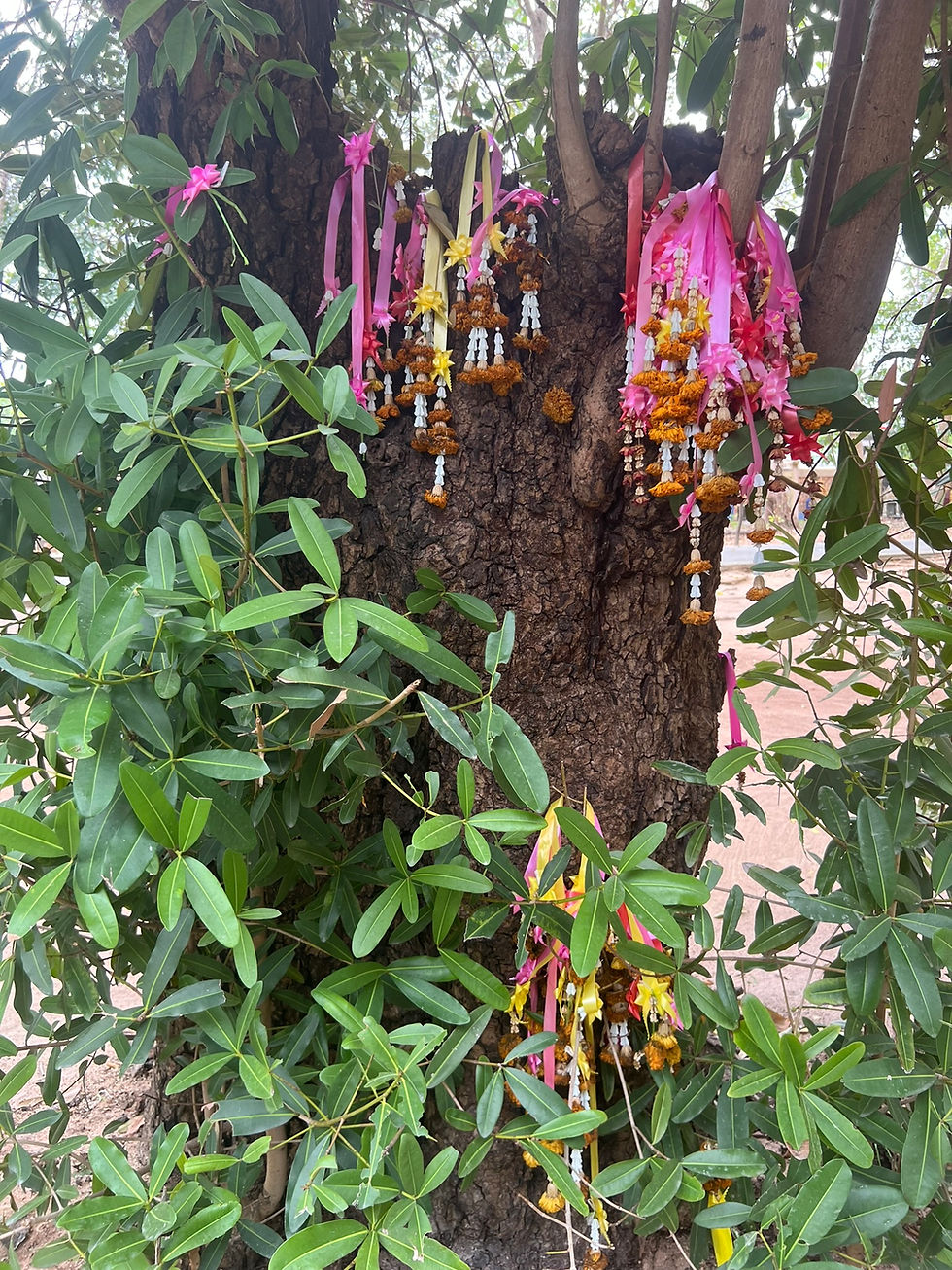 Leaving, we walked by a tree with ribbons and strung marigolds hanging from its branches. Dol saw me looking at the scene with sweet reverance and laughed, explaining that, though tourists think there's significance to this, it's really just a place to discard used blessings made at the temple.